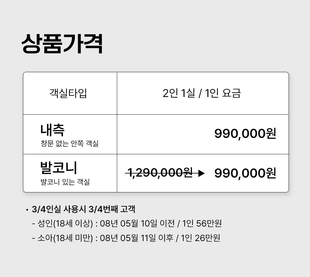 - 2인1실 기준 1인당 금액입니다.